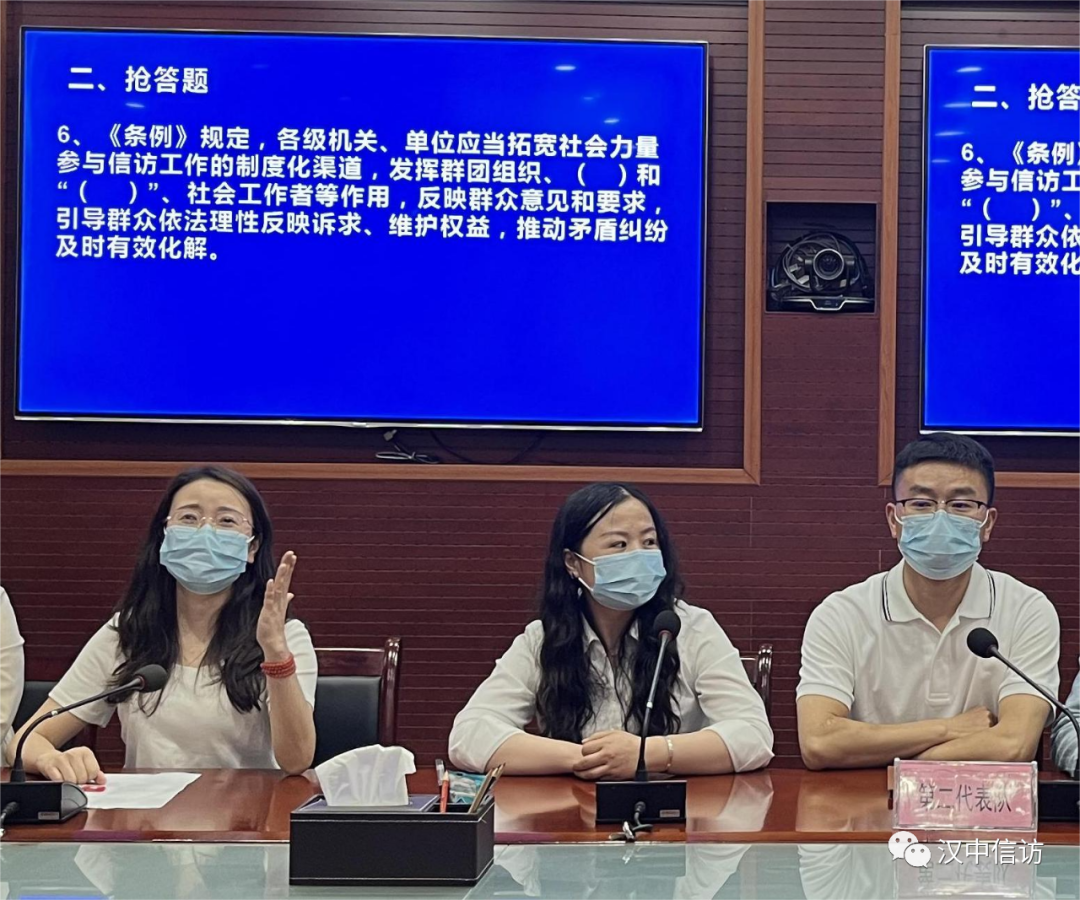 5月25日,汉中市信访局举办“学习新条例、展现新风采”为主题的《信访工作条例》知识竞赛,以此检验青年干部职工学习领会、综合运用《信访工作条例》情况,推动《信访工作条例》贯彻落实推进年活动走深走实,取得实实在在的效果。局班子成员全程观看了竞赛活动,并为获奖人员颁发证书,提出希望和要求。