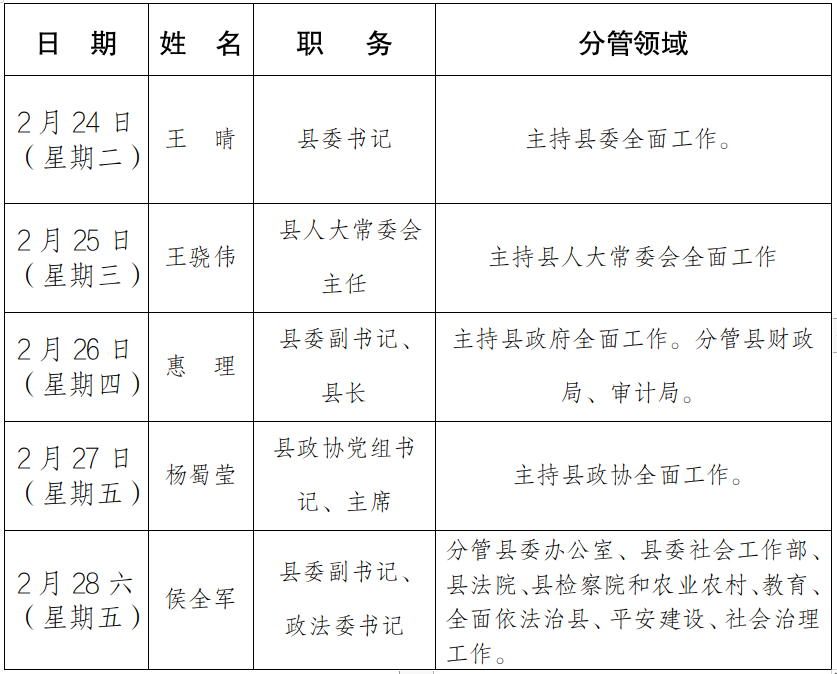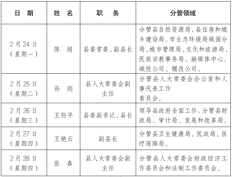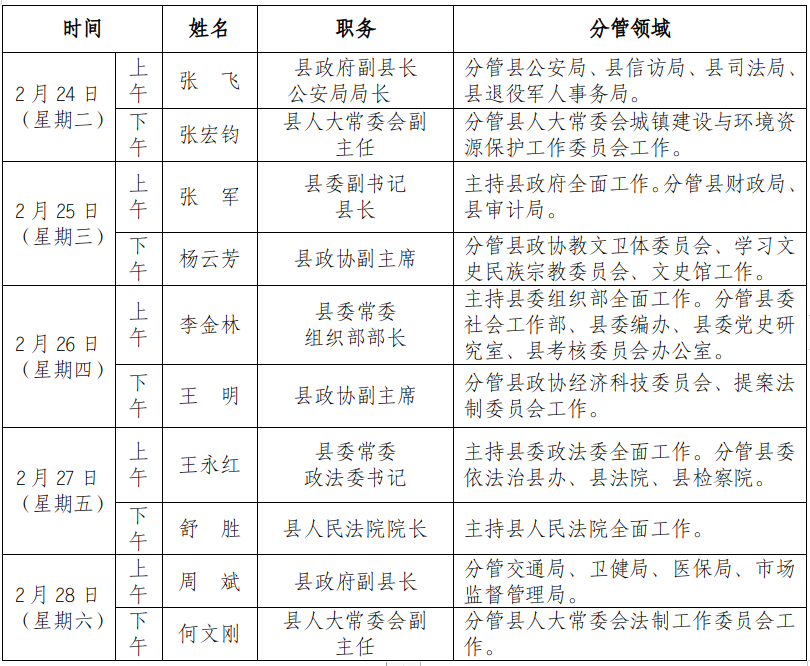 为进一步畅通信访渠道,方便群众及时就地反映诉求、解决问题,现将2月24日-28日县级领导在洋县信访接待服务中心公开接访安排计划公布如下: