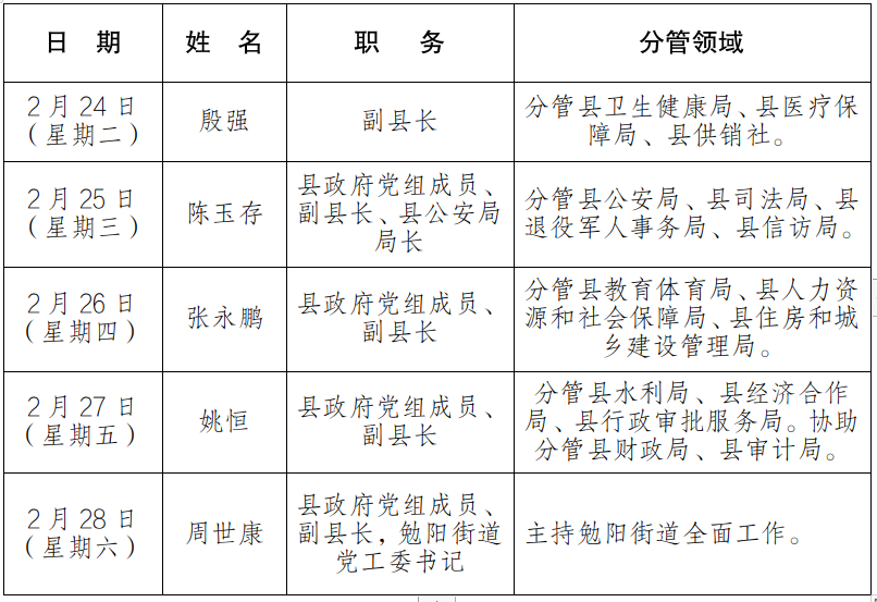 为进一步畅通信访渠道,方便群众及时就地反映诉求、解决问题,现将2月24日-2月28日县级领导在勉县综治中心公开接访安排计划公布如下: