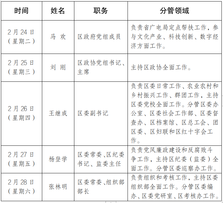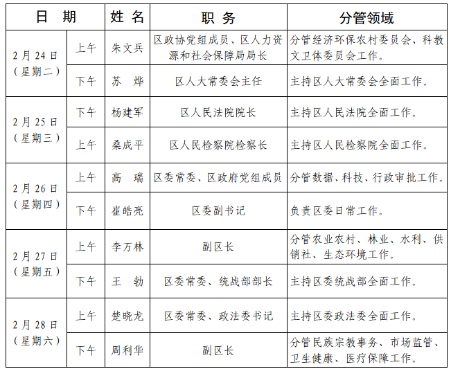 为进一步畅通信访渠道,方便群众及时就地反映诉求、解决问题,现将2月24日-2月28日区级领导公开接访和“局长坐诊”接诉工作安排公布如下: