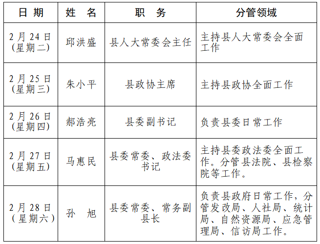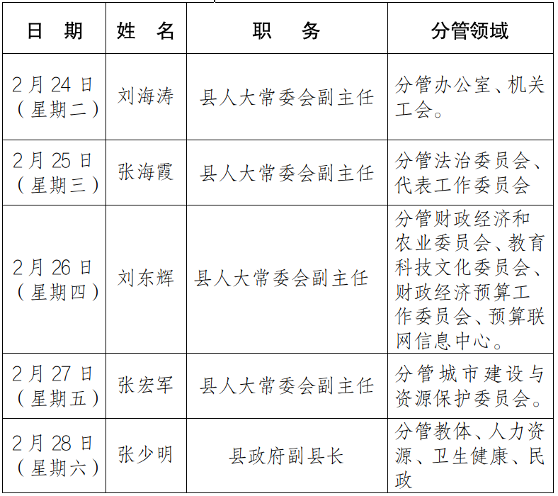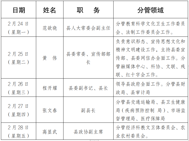 为进一步畅通信访渠道,方便群众及时就地反映诉求、解决问题,现将2月24日-28日县级领导在县综治中心信访接待大厅公开接访安排计划公布如下: