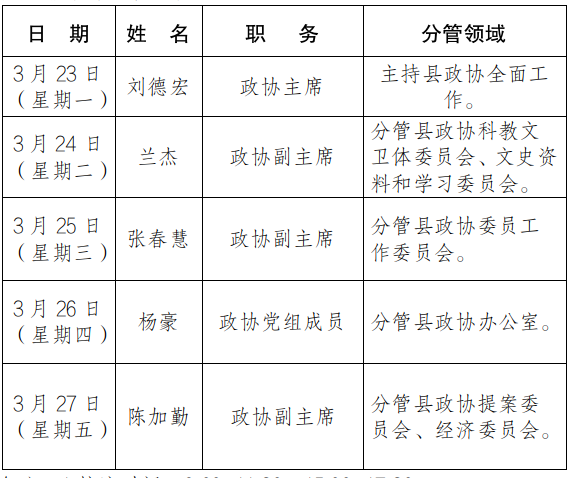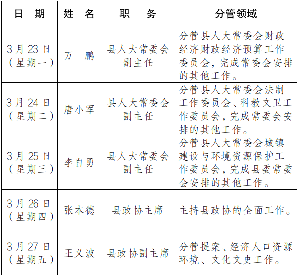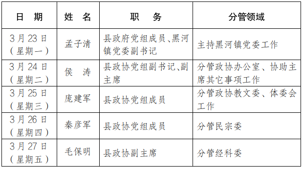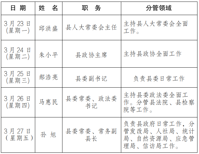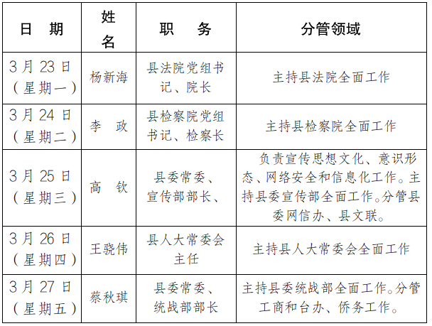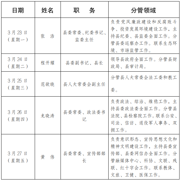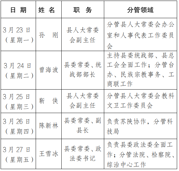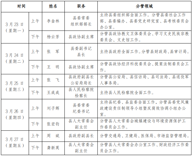 为进一步畅通信访渠道,方便群众及时就地反映诉求、解决问题,现将3月23日-3月27日县级领导在勉县综治中心公开接访安排计划公布如下: