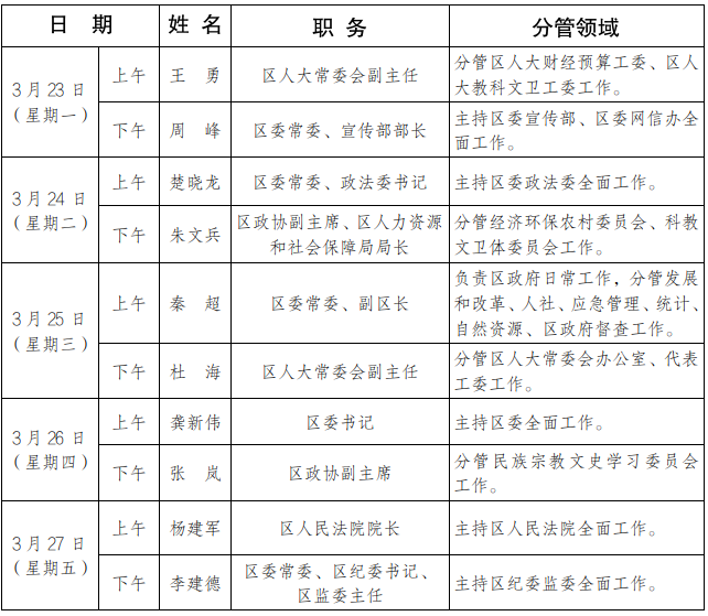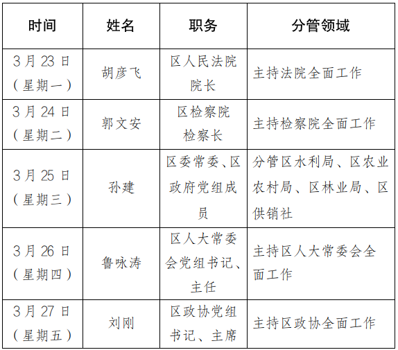 为进一步畅通信访渠道,方便群众及时就地反映诉求、解决问题,现将3月23日-3月27日区级领导在南郑区综治中心公开接访安排计划公布如下: