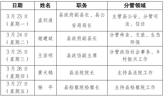 为进一步畅通信访渠道,方便群众及时就地反映诉求、解决问题,现将3月23日-3月27日县级领导在留坝县综治中心公开接访安排计划公布如下: