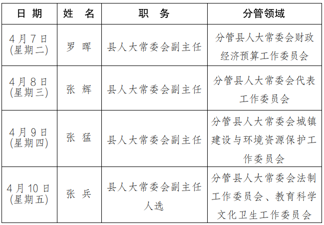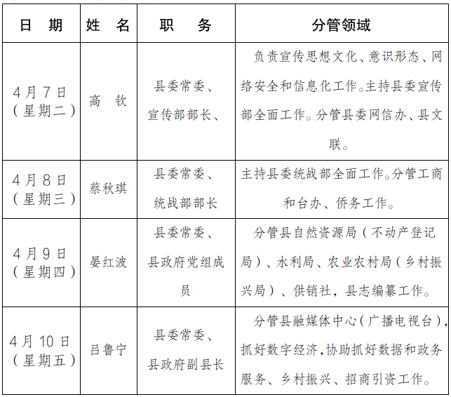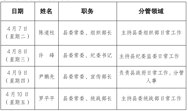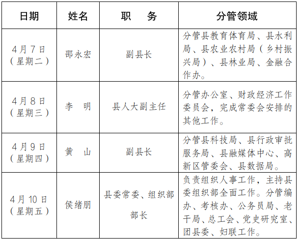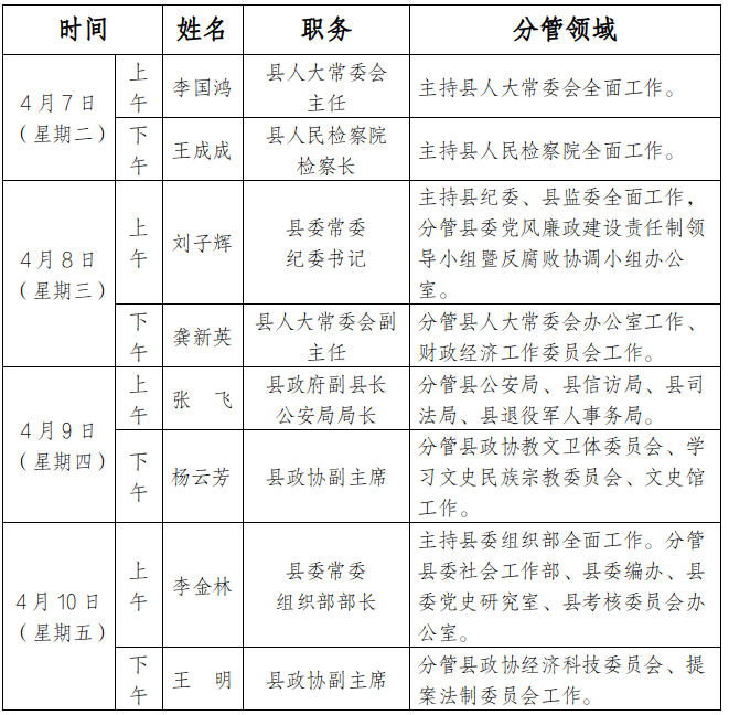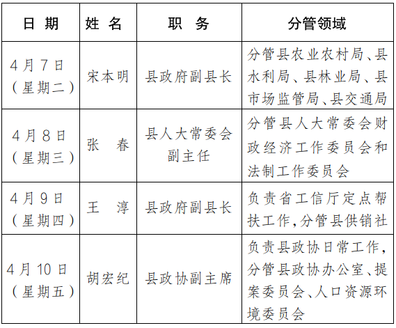 为进一步畅通信访渠道,方便群众及时就地反映诉求、解决问题,现将4月7日-4月10日县级领导在县综治中心信访接待大厅公开接访安排计划公布如下: