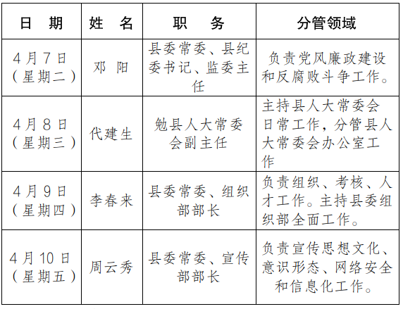 为进一步畅通信访渠道,方便群众及时就地反映诉求、解决问题,现将4月7日-4月10日县级领导在勉县综治中心公开接访安排计划公布如下: