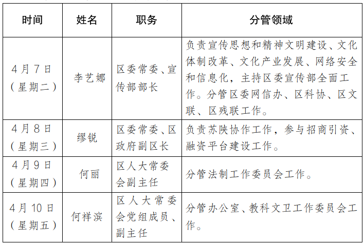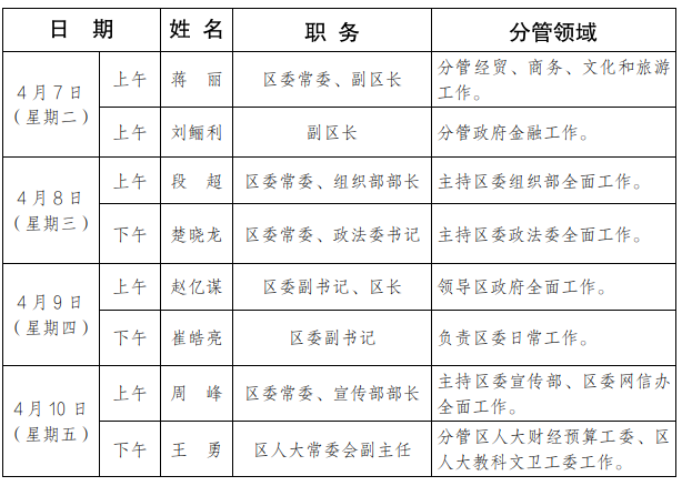 为进一步畅通信访渠道,方便群众及时就地反映诉求、解决问题,现将4月7日-4月10日区级领导公开接访和“局长坐诊”接诉工作安排公布如下: