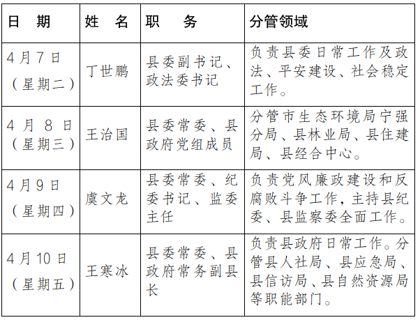 为进一步畅通信访渠道,方便群众及时就地反映诉求、解决问题,现将4月7日-10日县级领导在宁强县信访接待服务中心公开接访安排计划公布如下: