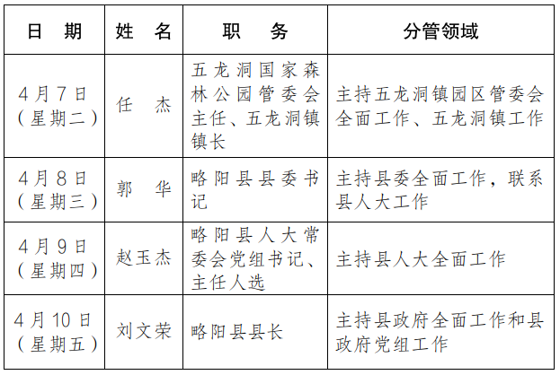 为进一步畅通信访渠道,方便群众及时就地反映诉求、解决问题,现将4月7日-4月10日县级领导在留坝县综治中心公开接访安排计划公布如下: