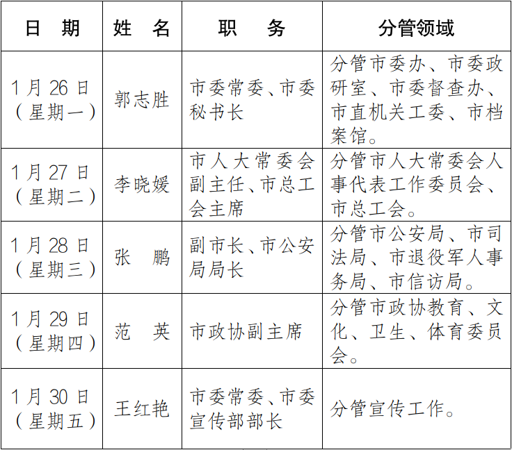 3.接访安排如因工作冲突等原因调整,具体接访领导以实际调整后的为准。