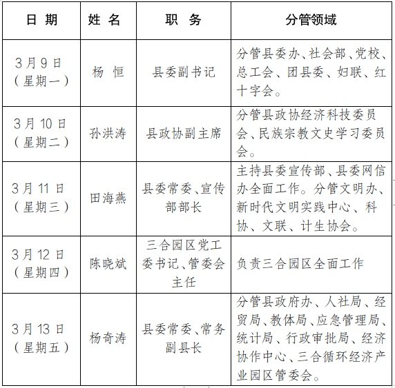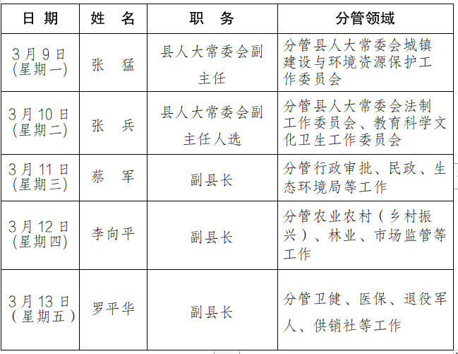 为进一步畅通信访渠道,方便群众及时就地反映诉求、解决问题,现将3月9日-13日县级领导在洋县信访接待服务中心公开接访安排计划公布如下: