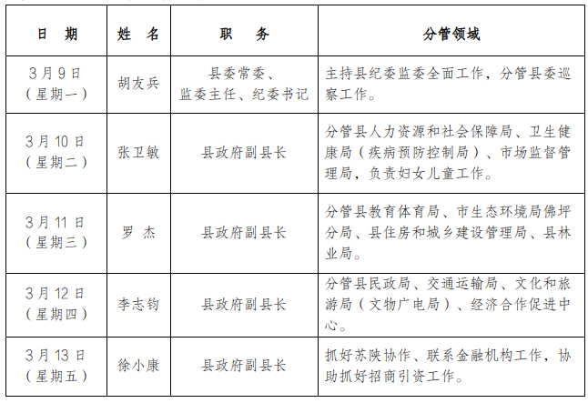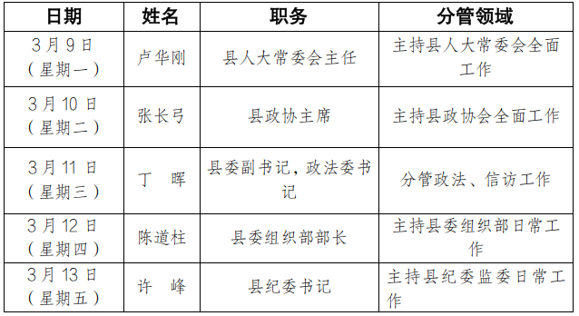 为进一步畅通信访渠道,方便群众及时就地反映诉求、解决问题,现将3月9日-13日县级领导在县综治中心群众接待大厅公开接访安排计划公布如下: