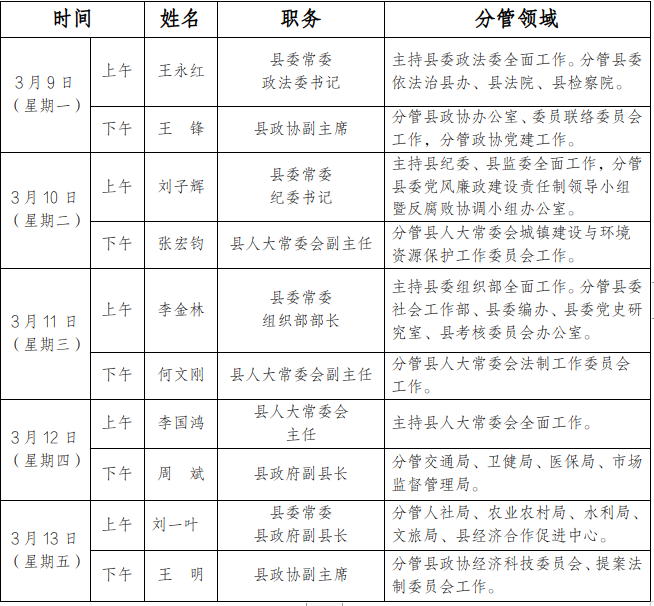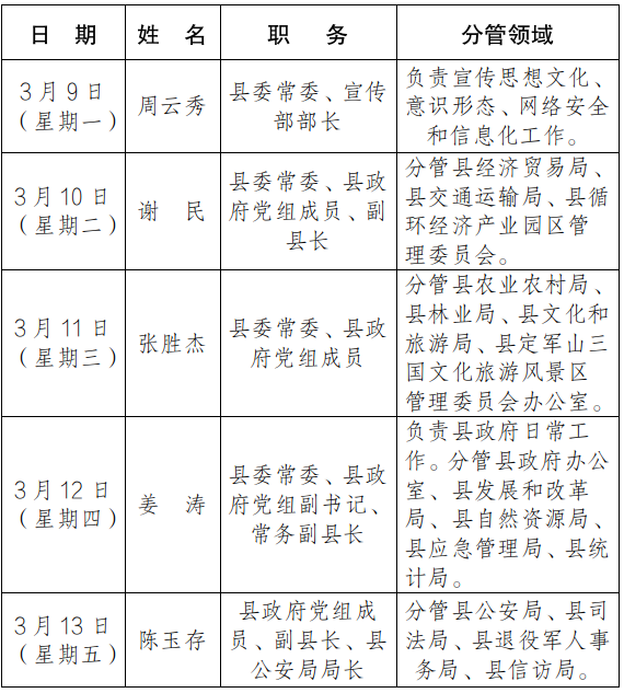 为进一步畅通信访渠道,方便群众及时就地反映诉求、解决问题,现将3月9日-13日县级领导在勉县综治中心公开接访安排计划公布如下:
