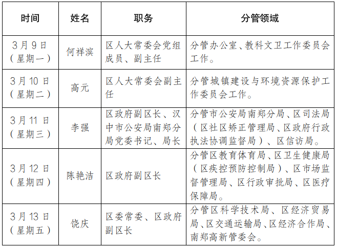 关于汉台区区级领导干部公开接访的公告 为进一步畅通信访渠道,方便群众及时就地反映诉求、解决问题,现将3月9日-3月13日区级领导公开接访和“局长坐诊”接诉工作安排公布如下:
