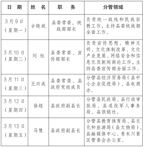 为进一步畅通信访渠道,方便群众及时就地反映诉求、解决问题,现将3月9日-13日县级领导在宁强县信访接待服务中心公开接访安排计划公布如下: