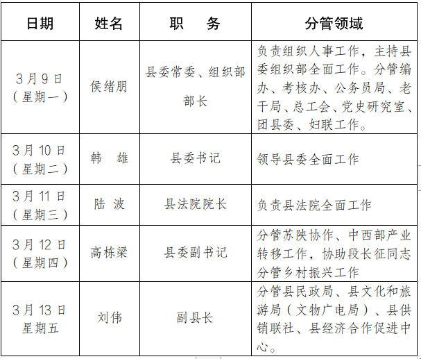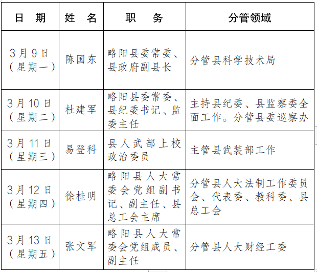 备注:1.接访时间:9:00-11:30、15:00-17:30。 2.接访地点:宁强县信访接待服务中心(宁强县民主街县政协一楼)。 3.接访安排如因工作冲突等原因调整,具体接访领导以实际调整后的为准。 关于略阳县县级领导公开接访安排的公告 为进一步畅通信访渠道,方便群众及时就地反映诉求、解决问题,现将3月9日-13日县级领导在县综治中心信访接待大厅公开接访安排计划公布如下: