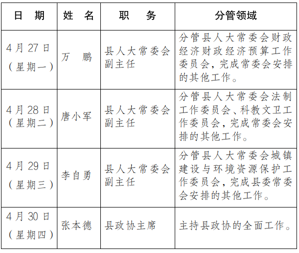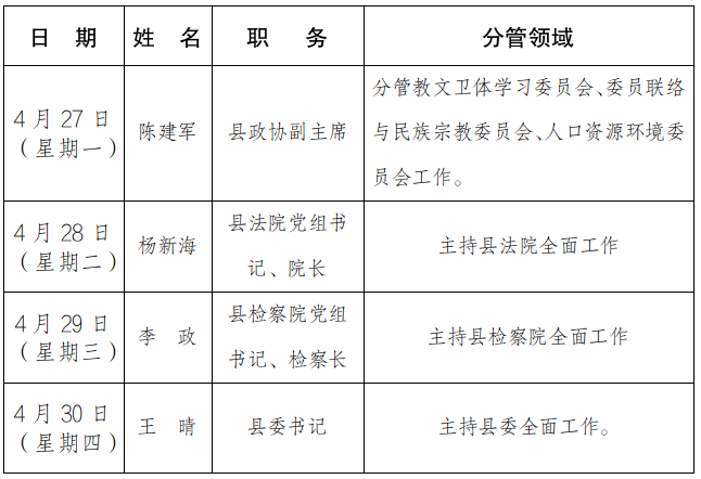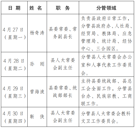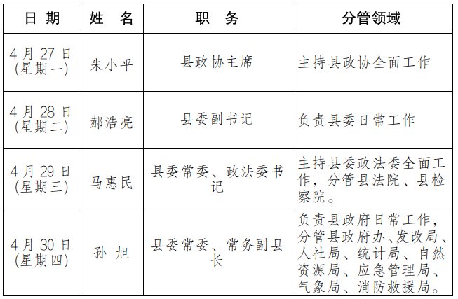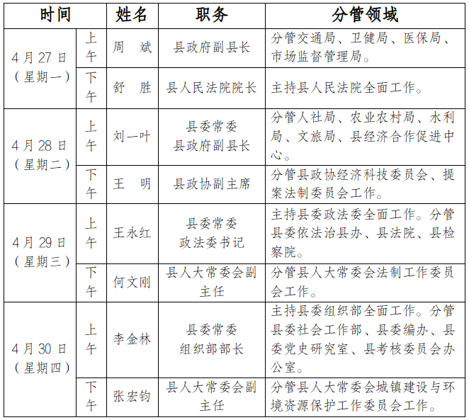 为进一步畅通信访渠道,方便群众及时就地反映诉求、解决问题,现将4月27日-4月30日县级领导在县综治中心信访接待大厅公开接访安排计划公布如下: