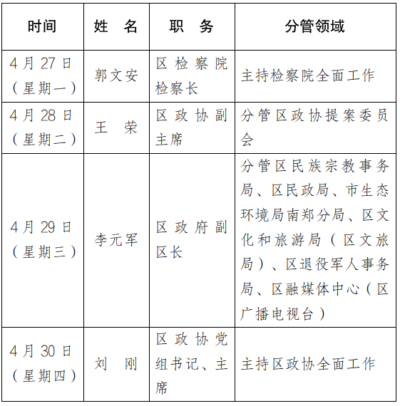 为进一步畅通信访渠道,方便群众及时就地反映诉求、解决问题,现将4月27日-4月30日区级领导在南郑区综治中心公开接访安排计划公布如下: