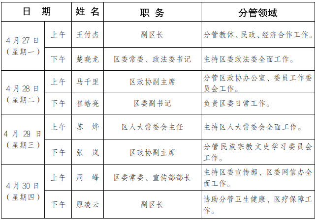 为进一步畅通信访渠道,方便群众及时就地反映诉求、解决问题,现将4月27日-4月30日区级领导公开接访和“局长坐诊”接诉工作安排公布如下:
