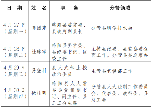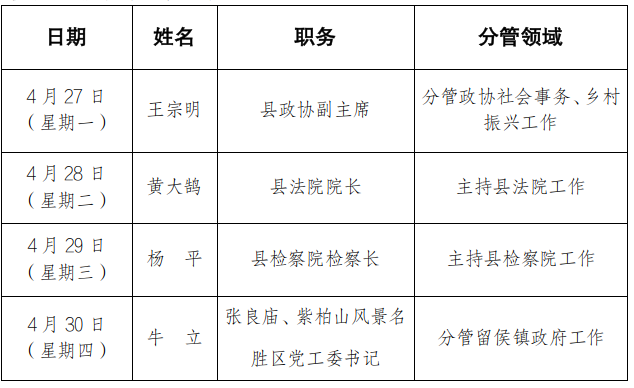 为进一步畅通信访渠道,方便群众及时就地反映诉求、解决问题,现将4月27日-4月30日县级领导在留坝县综治中心公开接访安排计划公布如下:
