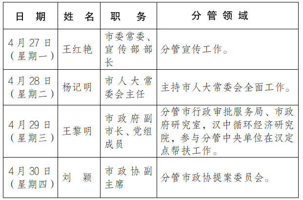 为进一步畅通信访渠道,方便群众及时就地反映诉求、解决问题,现将4月27日-4月30日市级领导在汉中市信访接待中心公开接访安排计划公布如下: