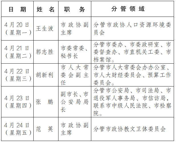 3.接访安排如因工作冲突等原因调整,具体接访领导以实际调整后的为准。